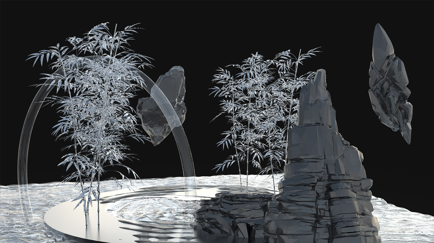 基于这种“错误”,设计师运用“竹”作为描述,生成了大量以中国山水画为题材的作品。她从这些画中提取了象形元素,重设计,并将其与虚拟时尚融合,创造出了一批新中式风格的服装。